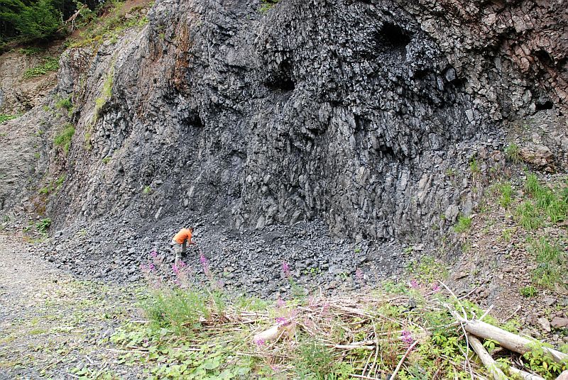 Da der Ausflug am Loser doch recht kurz war, bleibt noch genügend Zeit um zwei geologische Besonderheiten im Bereich der Blaa-Alm zu besuchen. Hierzu parken wir bei Holzstube und spazieren im kühlen Wald zur Fludergrabenalm, wo wir der Knerzenalm-Forststraße in Richtung Südwesten folgen. Entlang der Forstraße wächst immer wieder der Rote Holunder (Sambucus racemosa), der giftige Bruder des Schwarzen Holunders (Sambucus nigra). Wo die Forstraße den Fludergraben quert befindet sich ein 20 Meter hoher Steinbruch, wo eine im Dezimeter-Bereich gebankte Schichtfolge von hell- bis schwarzgrauen Radiolariten aus dem Jura (Oxfordium) aufgeschlossen ist. Dies ist insofern bemerkenswert, da hier nicht Kalk (Calciumcarbonat) sonder Silizium dominiert. Und diese Siliziumsedimente sind biogen, d.h. wurde von Lebewesen gebildet. Im Gegensatz zu kalkbildenden Korallen oder Muscheln, wurde dieses Material durch die Skelette von Strahlentierchen (Radiolaria) abgelagert. Diese mikroskopisch kleinen Lebewesen (meist kleiner als 100 µm) bilden ein Endoskelett aus Siliziumdioxid und geben dem Gestein auch seinem Namen. Radiolarite sind Tiefseeablagerungen, im Gegensatz zum Dachsteinkalk, der in Lagunen und Riffen abgelagert wurde. |