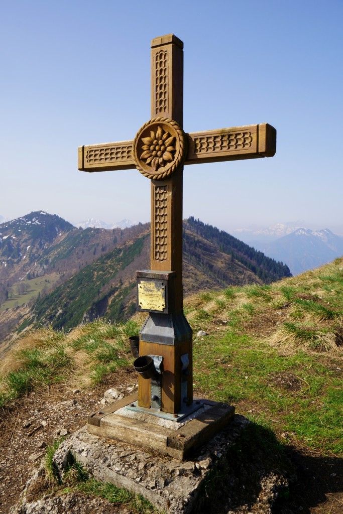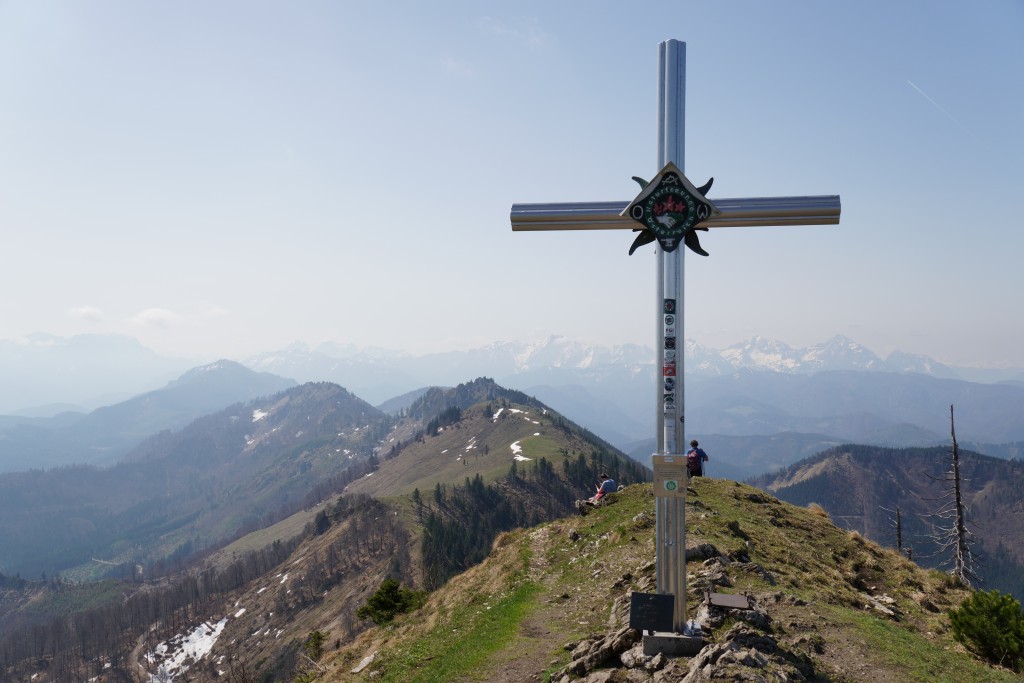 | Nachdem ich im Februar den Wikipedia-Artikel zum Reichraminger Hintergebirge fertiggestellt habe, ist ein Besuch den Almkogels und der Ennser Hütte notwendig. Diese Gegend ist mir völlig unbekannt und so starte ich sehr neugierig meine Exkursion am Parkplatz Bamacher. Der nordseitige Anstieg im Graben schneidet immer wieder die Serpentinen der Forststraße ab, die auch als Mountainbike-Strecke ausgewiesen ist. An feuchteren stellen wachsen Massen an Bärlauch (Allium ursinum) durchsetzt vom Kleeblättrigen Schaumkraut (Cardamine trifolia). Bei einer Abzweigung lese ich "Burgspitz 1h". Ich habe genug Zeit und das Wetter ist ausgezeichnet. So beschließe ich spontan, noch diesen Gipfel zu besuchen, den ich 40 Minuten später erreiche. Die Fernsicht ist sehr gut, aber auch ungewohnt. Um die Hügel und Ortschaften im Norden und Osten zu identifizieren, brauche ich die Karte. Die Gipfel im Südosten um den Größtenberg sind jedoch wohl bekannt.