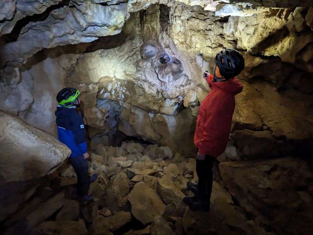 Zusammen mit Familie Riedl verbringen die Bergfexings ein Wochenende auf der Tauplitzalm. Heuer haben wir uns als Basislager die Gindlhütte gemietet. 2022 sind wir nur rund 50 Meter in das Käferloch vorgedrungen. So sind Joni und Erik heute hochmotiviert, die Höhle auf gesamter Länge zu befahren. Praktischerweise befindet sich das weithin sichtbare Portal gleich hinter der Gindlhütte. Das Wetter ist stark bewölkt, aber trocken. Es ist auch kein Niederschlag angekündigt und so steht einem Höhlenabenteuer nichts mehr im Weg. Flott erreichen wir den Eingangsteil der Höhlenruine mit Naturbrücke, Pfeiler und Schlot. Wir rüsten uns mit Helm und Beleuchtung (und Ersatzlampe) aus, bevor wir den Eingangschluff überwinden. Danach wird die Höhle geräumiger und wir kommen rasch vorwärts. Fast schon etwas zu schnell, denn die Burschen sind deutlich geschickter als ich. Mit einigen Fotopausen kann ich sie jedoch einbremsen. An manchen Stellen finden wir Bergmilch und Sinterbildungen. Nach rund 40 Minuten und 200 Metern erreichen wir das Ende des Käferlochs. Erik und Joni sind sichtlich stolz. So eine Höhlenbefahrung ist für Nicht-Speläologen schon ein besonderes Erlebnis. Der Retourweg ist mit 20 Minuten dann deutlich kürzer und wir staunen nicht schlecht, als uns beim Portal ein sonniger Junitag empfängt. |