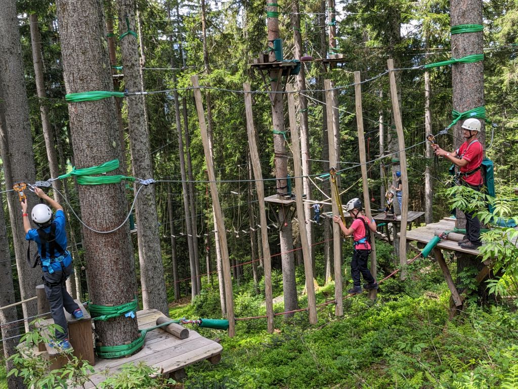 Heute klappt es mit dem Hochseilgarten. Die Kids wollen natürlich gleich losstarten, aber zuerst müssen wir noch eine Unterweisung absolvieren. Das System zum Sichern finde ich überzeugend. Es ist während einer Route unmöglich sich auszuhängen. Also absolvieren wir der Reihe nach alle leichten Routen. Besonders die Seilrutschen machen Spaß. Wenn man mangels Körpergewicht hängen bleibt, rückt ein Betreuer als Bergretter aus :) Auch die mittelschweren Routen sind für uns kein Problem. Erik und Julia stellen sich sehr geschickt an und haben ein gutes Gespür für die Technik. Kein Wunder: Wir sind ja auch Berger und keine Gruber :) |