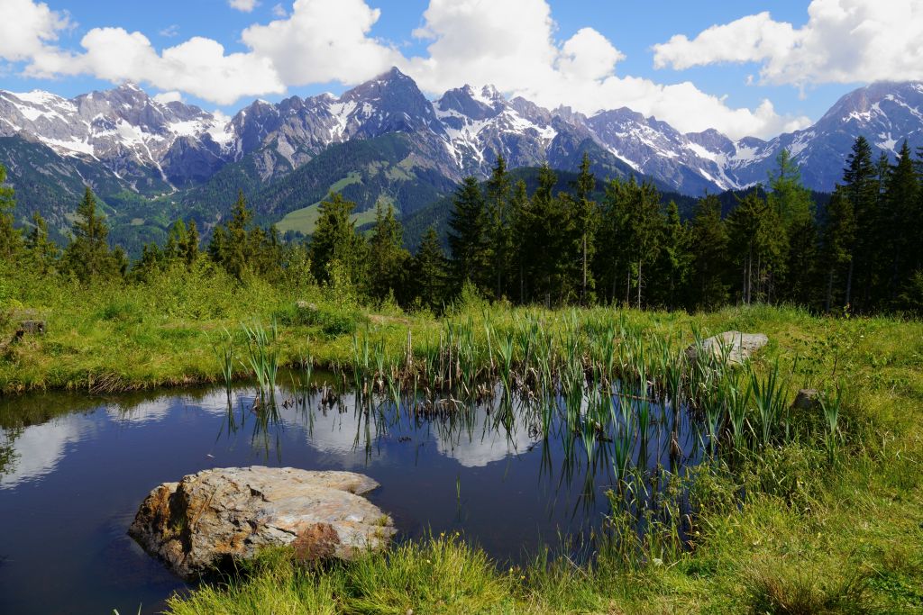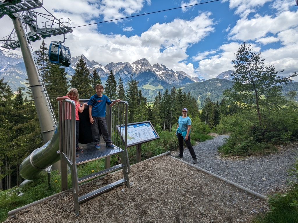 Wie auch in den letzten Jahren verbringen wir im Mai ein paar schöne Tage am Fuße des Steinernen Meers und machen einen Abstecher auf den Natrun. Der Waldrutschenpark steht zwar immer noch hoch im Kurs, aber die Kids wollen unbedingt den Hochseilgarten ausprobieren. Da er noch nicht geöffnet hat, wandern wir zum kleinen Tümpel östlich des Speichersees. Ich muss noch eine unbestätigte Pflanzenbestimmung vom letzten Jahr nachholen: Langblättriges Laichkraut (Potamogeton praelongus) oder nicht ist die Frage. Also hinein ins kühle Nass und ich fische mir ein Exemplar. Obwohl die Pflanze noch keine Schwimmblätter ausgebildet hat, ist sie schnell als Alpen-Laichkraut (Potamogeton alpinus) bestimmt. Nach getaner Arbeit spazieren wir rasch zur Bergstation retour. Leider sind inzwischen alle Klettergurte in Kindergröße weg. Julia und Erik sind natürlich enttäuscht. Wir beschließen die Kletterpartie morgen nachzuholen. Dank der vielen und sehr steilen Rutschen klappt der Abstieg rasant. |